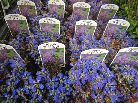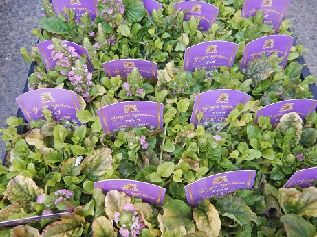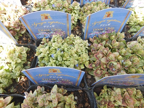日陰の主役!?アジュガ軍団もいろいろ入り始めました(*'ω'*)『デュキシーチップ』は斑入り葉にライトブルーのお花、『ゴールドライム』はライムリーフにピンクのお花、『チョコチップ』はブラックリーフにブルーのお花。みんな違ってとってもかわいい♪♪(≧▽≦)横広がりするので、びっしり生えてると、お花が咲く頃がとっても素敵です(*'▽')