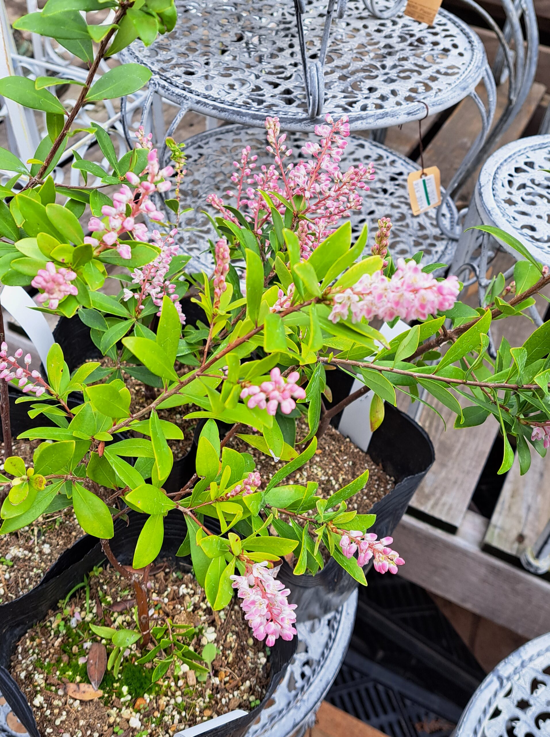 その中でもジャジャーン!!超珍しい(らしい)かわいい木が!!( *´艸`)クリフトニア『ベビーピンク』と言う木だそうです。ほどんど流通してないらしいですよ(*´ω`*)ネット見ても白は出るんですがピンクが出てなくて(´▽`*)ってことで、珍しいらしいんですけど、小さなピンクのお花が小さな房状に咲いてます。この色とお花がかわいいの♪♪(≧▽≦)