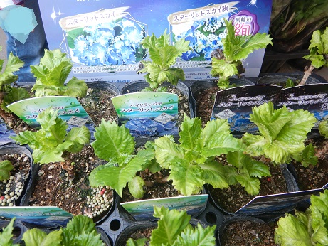 宿根草コーナー近くのアジサイ苗コーナーに西洋アジサイ『スターリットスカイ』と『スターリットスカイ絢』が入荷しました!!お花の色がブルーと白の絞りガラでかっこいいんですけど、その中でも『絢』の方は黒軸なんですよ(≧▽≦)これがまたかっこいい( *´艸`)