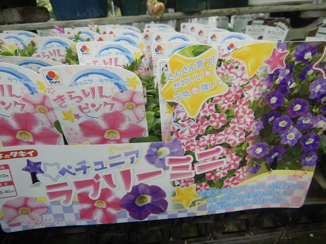 『ビーニーズ』『春きらり』『ラブリーミニ』は新しい品種です(*´▽`*)みんな花色が変わってたり、雨に強かったり、いろんな形で改良されて出てきた品種なので、期待値高し!!まだ育てたことない品種もいろいろあるので、お店でも試してみますね~( *´艸`)