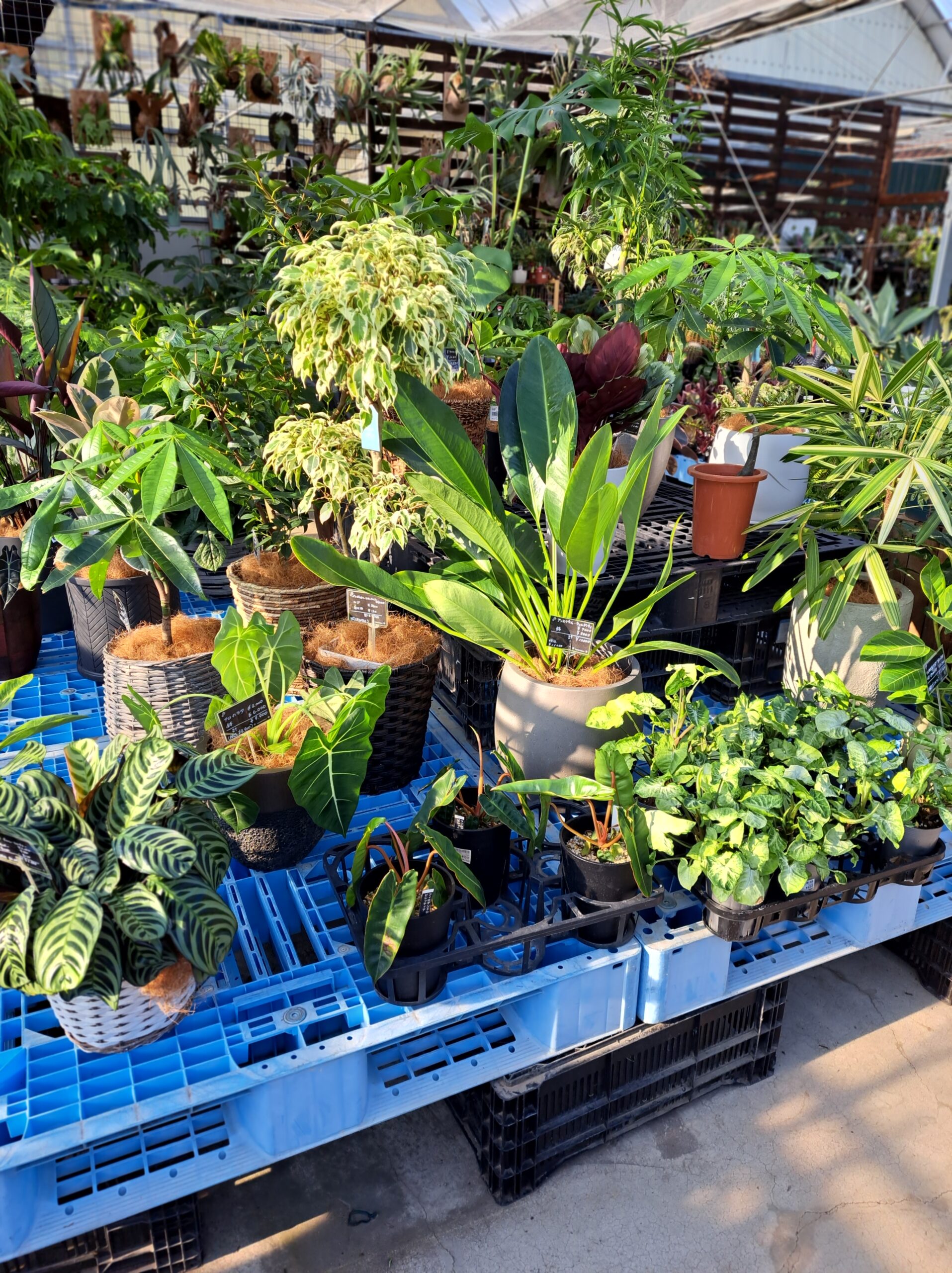 ハウス奥、野菜コーナーの後ろの観葉植物コーナー、ちょっと飾りこんだ観葉植物のコーナーにしてます(*^-^*)籠や鉢をセットにしてるので、そのまま贈り物にも( *´艸`)ぜひのぞいてみてね♪♪