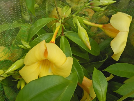 夏に強いアラマンダ『ヘンダーソニー』。大輪のタイプ(*^-^*)夏の日射しを浴びてお花がいっぱい咲くみたいなので、大株に仕立てあげてみたいお花です(*'▽')