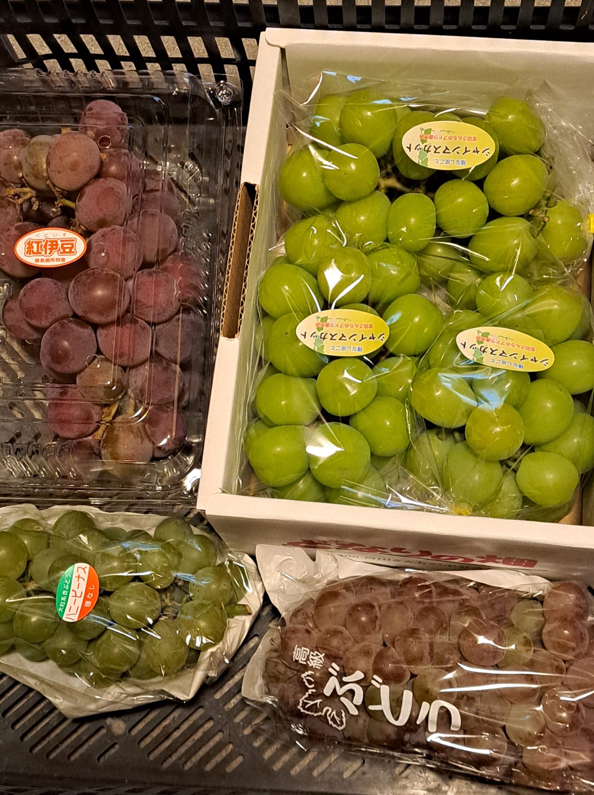 今週のブドウは『紅伊豆』『シャインマスカット』『ハニービーナス』『サニールージュ』。ちなみに巨峰とピオーネはお家に常備されてます(笑)( *´艸`)