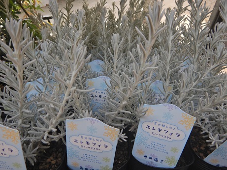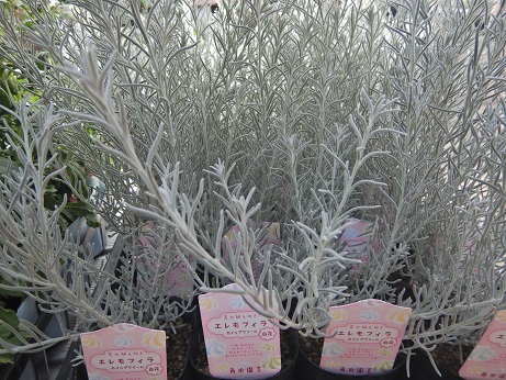 モフッとした白いリーフが可愛いエレモフィラ。今回入荷の『ホイップクリーム』は珍しい白花。『スノークリスタル』は普通のエレモフィラ『ニベア』に比べて、ちょっとコンパクトでモフモフ感が強いのが特徴です( *´艸`)これからのシーズン、寄せ植えにおススメ♪♪