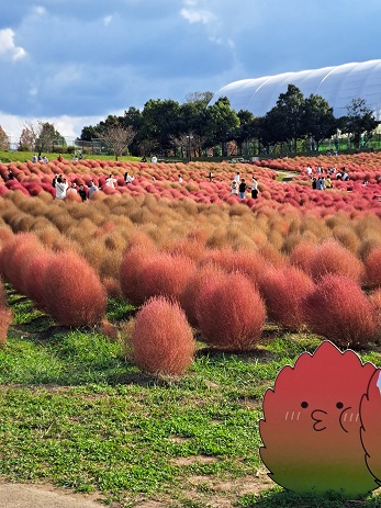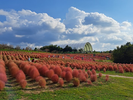 香川のまんのう公園。この時期は『コキア』(別名:ホウキ草)が真っ赤に色づく時期…だったのですが、今年は夏にちょっと虫付いたりして、うまく真っ赤にならなかったみたいでした(;・∀・)広いとこだから、管理も大変ですよね( ;∀;)それでも、こんもり丸いコキアがずら~っと並んでる光景は可愛かったです♪♪
