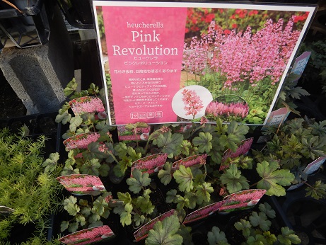 リーフコーナーのおすすめはリーフだけでもきれいなツルニチニチソウ『ビンカミノール』(ハンギングにすると単品でも可愛い♪♪)、黄色のお花が咲き始めると急に人気が出る『ラッキークローバー』、そして、最新品種!!ヒューケレラ『ピンクレボリューション』。ピンクのお花が可愛いヒューケレラみたいです(≧▽≦)日陰に可愛いですよね♪♪
