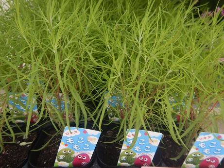 秋に真っ赤になるのが楽しみな『コキア』(ホウキグサ)(*^-^*)今から植えておくとけっこう大きくなって丸っこい『スーモ』みたいなのができます(≧▽≦)秋になって寒さに当たると真っ赤になって『カルシファー』みたいになります。…だいたい言ってるキャラ、分かります?(;・∀・)