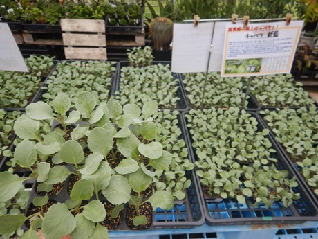 野菜コーナー、葉菜の種類増えてきました(*´▽`*)キャベツ、ブロッコリー、カリフラワーはプラグ苗も出てますので、数を植えたい方はこちらがおススメ♪♪ちょっと小さい苗ですけど、割安です(*^-^*)