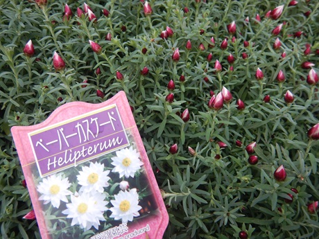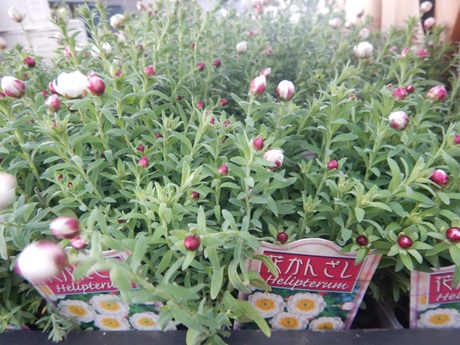 これから長く楽しめる『ヘリクリサム』寒いのが得意で、ドライフラワーにもなるカサカサのお花がとっても長持ち♪♪ペーパーキャスケードは名前の通り横に流れるように咲くので、ハンギングにもおススメ。花かんざしは株がこんもりなってくるので寄せ植えにおすすめです(*^-^*)同じようなお花なんですけど蕾を見てもらうと一目瞭然。ペーパーキャスケードのほうが蕾がとがってて、花かんざしのほうは丸っこいんです。…ということで、お花が咲くと、ペーパーキャスケードのお花はとんがり気味になります(*'ω'*)