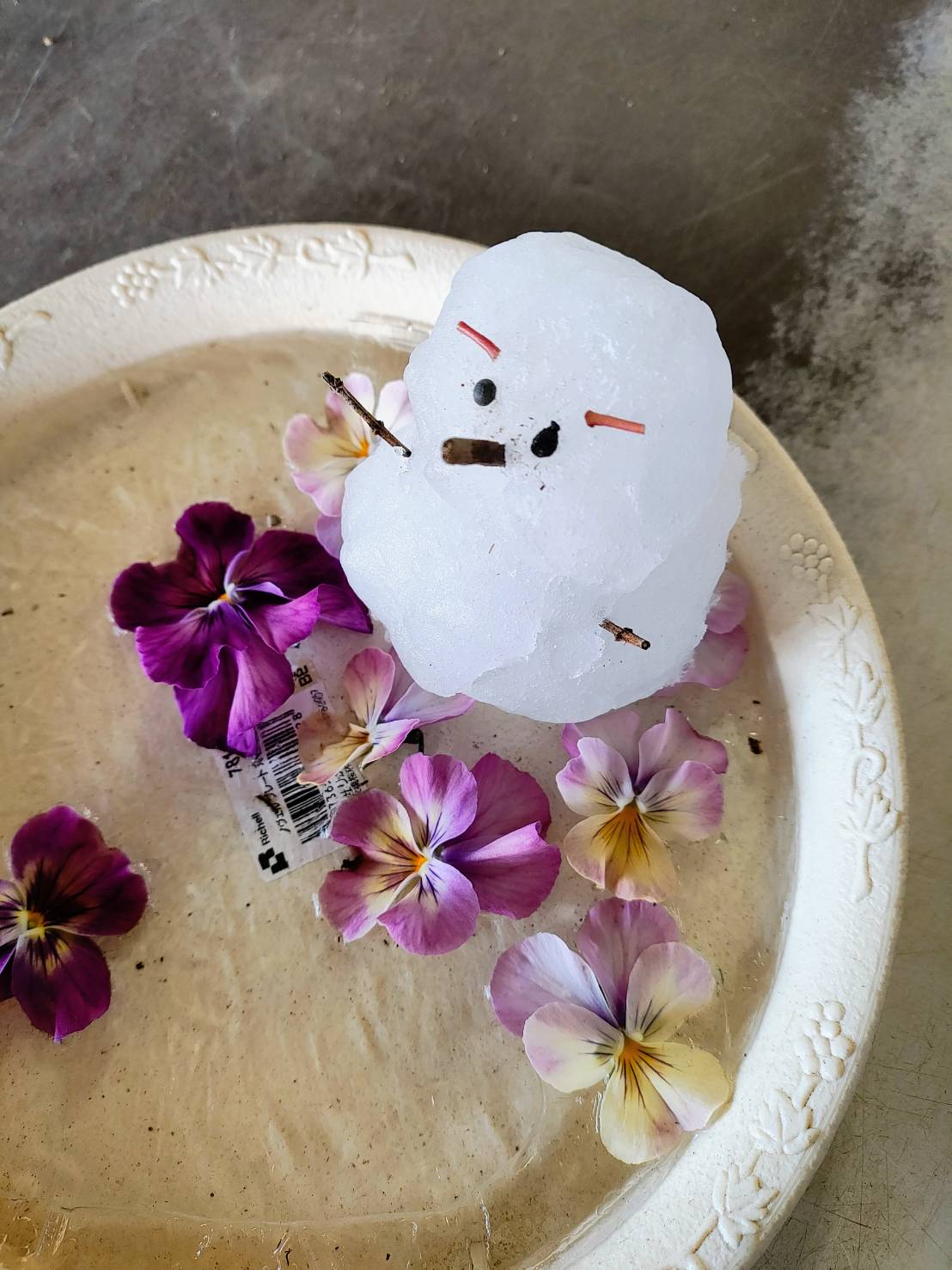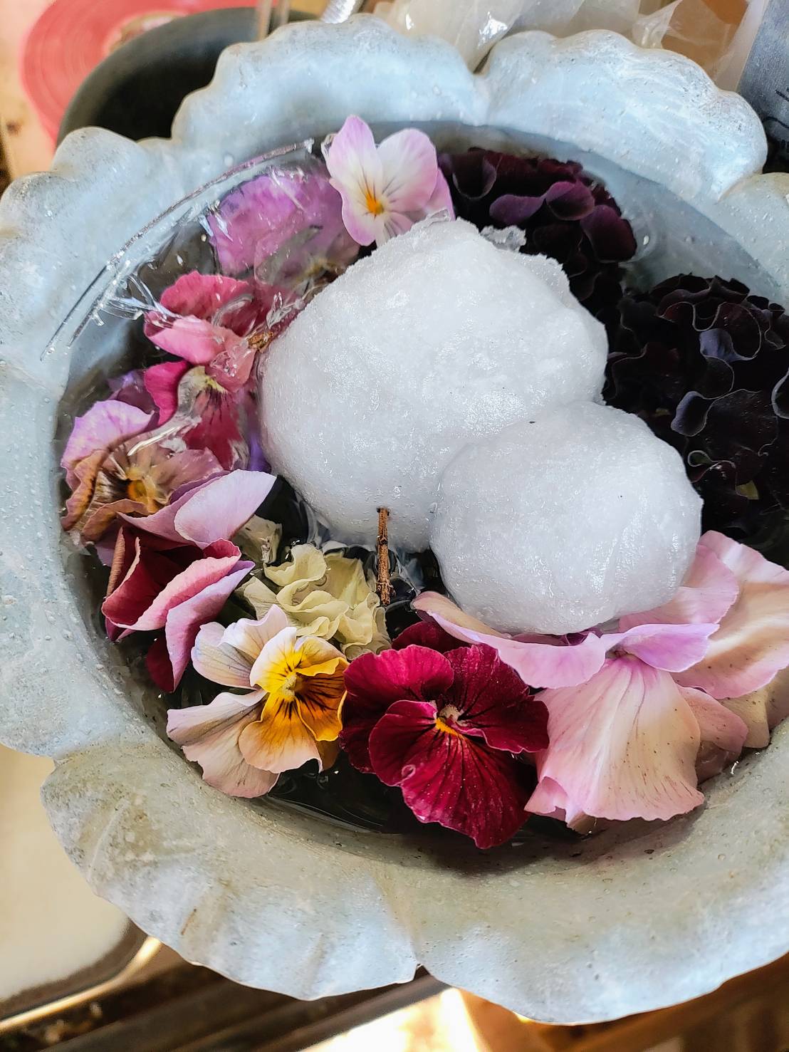 器に氷が張ってて、その上に鎮座してたんですよ。せっかくお花に囲まれてめっちゃ可愛いから、レジ前で花手水(はなちょうず)みたいになってる器に飾ろうと思ったら…。