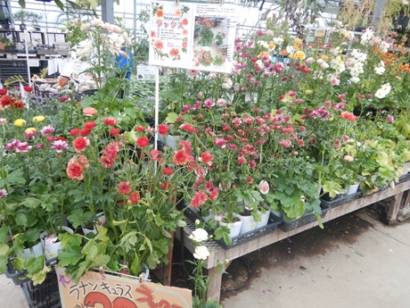 ラックスラナンキュラスコーナー、お庭では今から咲いてくる時期なんですけど、在庫が多くなったので、きゅうきょ割引始まりました!!今ならいろいろ色あるから選べるよ~(≧▽≦)