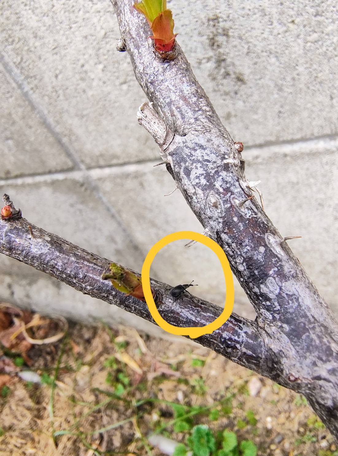 芽が出始めたバラの木にゾウムシを見つけてしまった( ;∀;)