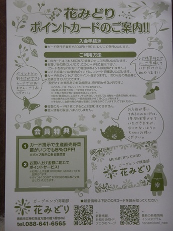 花みどり、ポイントカード廃止にする予定だったんですけど、いまだに「作れませんか?」って聞いてくださるお客様多くて、この度、復活することになりました(*´▽`*)入会費300円かかりますが、ポイントが付くのと、農場生産のお野菜苗が5%引きで購入していただけます。あと、カード提示で1日に1セット限りですが、花と野菜の土(340円+税)のセット売りができるようになります(4袋1100円+税)。