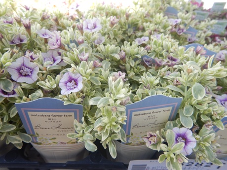 ペチュニア類では人気のホイップマカロンや、ちょっと珍しい斑入りのカリブラコア『ボウヌユムール ホーリーパープル』