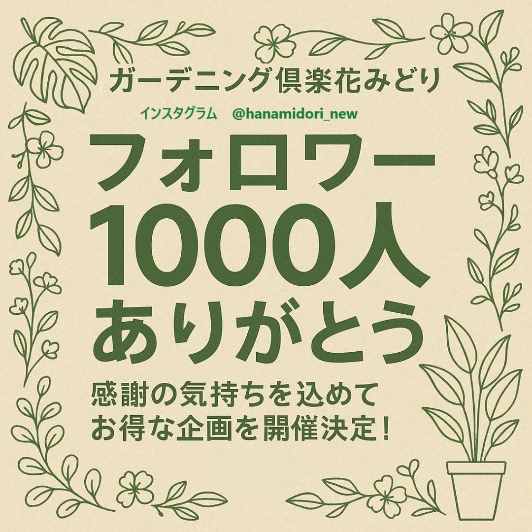 そうそう、今週いっぱいの期間限定企画なんですけど、花みどりの新着インスタグラム@hanamidori_newのフォロアーが1000人を突破いたしまして、感謝の気持ちを込めた特別企画をご用意しました(*´▽`*)