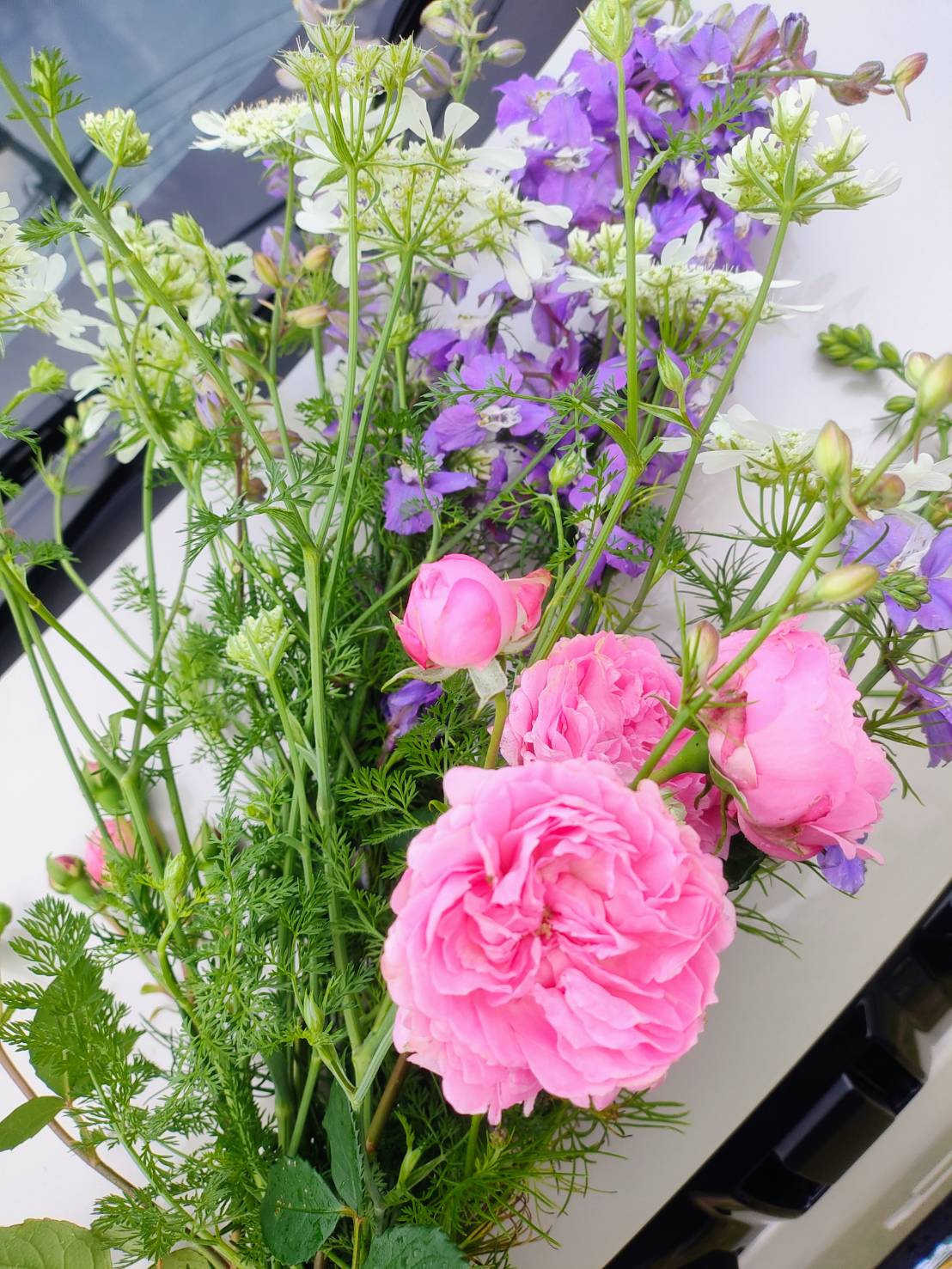 オルレアもだいぶ真っ白に咲き誇り始めましたので、今週のコバタケ花束はオルレアにラークスパー、バラは切り花にもとっても長持ちする『みやこ』を添えて( *´艸`)湿度高くなってくると病気が入らないか心配ですけど、花盛りのお庭は心が弾みますね(*´▽`*)