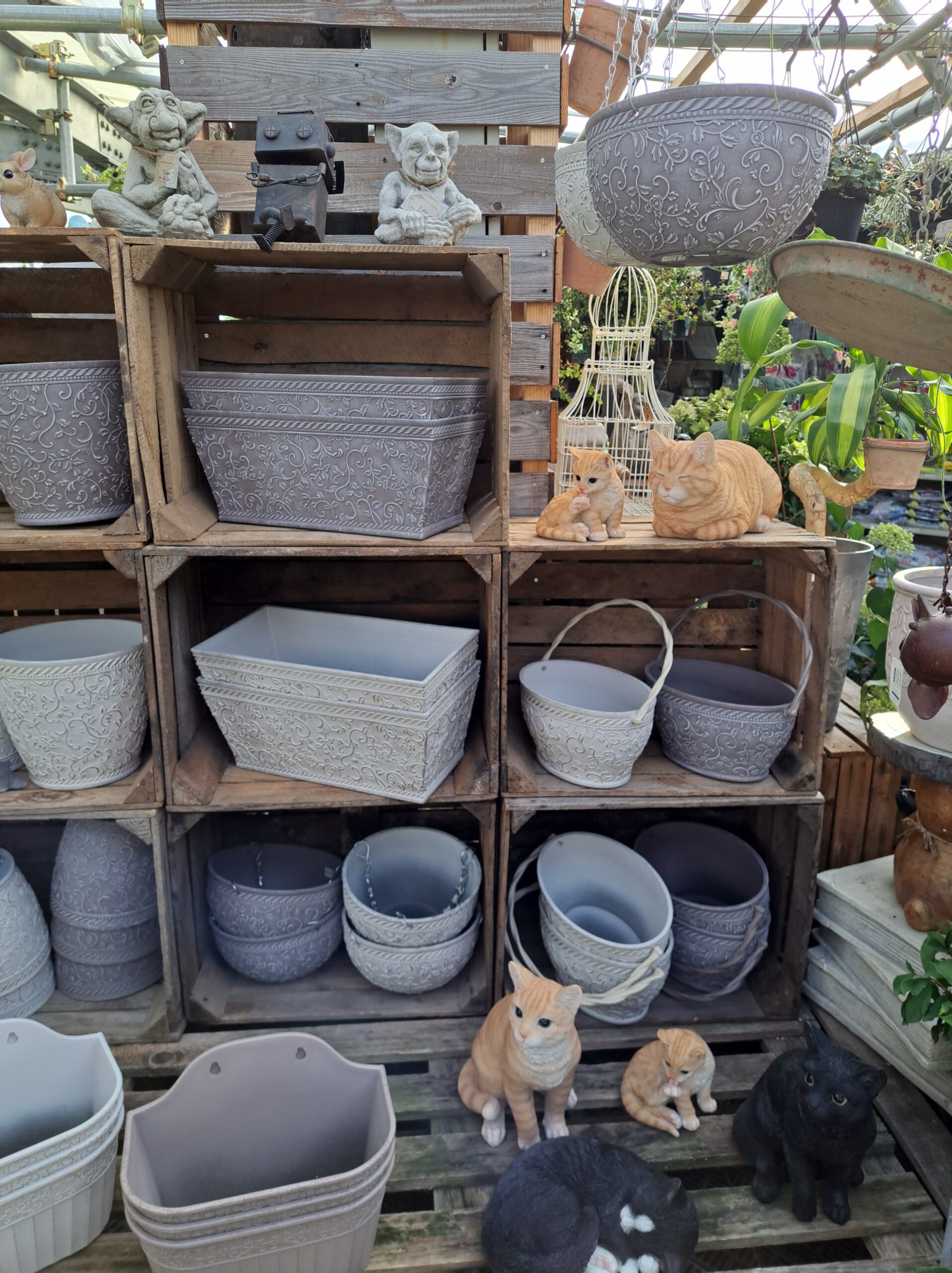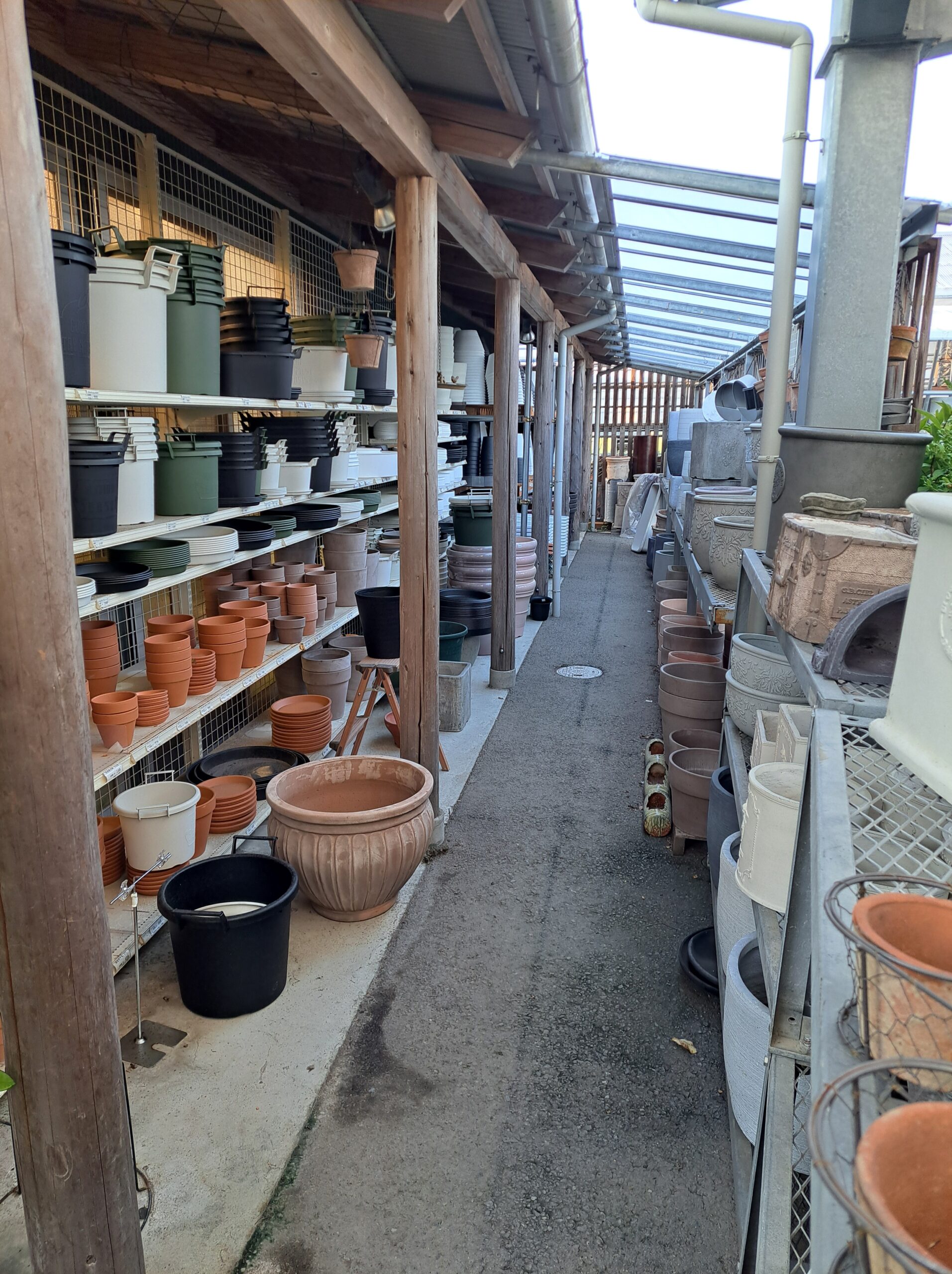 観葉の建物の東側通路には、プラスチック鉢の大きいものと、素焼き鉢、あと、陶器類の大きなものが並んでます(*´▽`*)