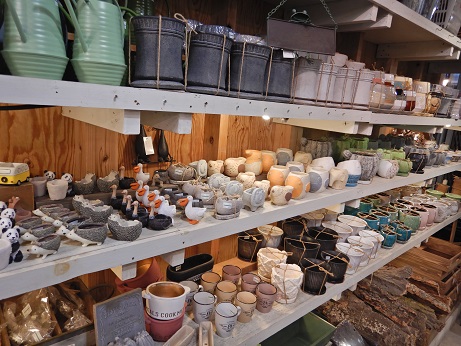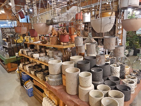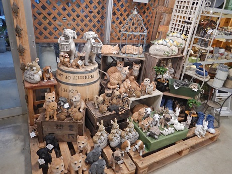 観葉コーナー入口、ペットショップみたいになってます(笑)けっこう本物に見えるカワイイわんにゃんそろってます。ちなみに、レジ前に芝犬の『太郎』が入荷してます。毎朝、スタッフが(本物と見間違えて)びっくりしてます(笑)