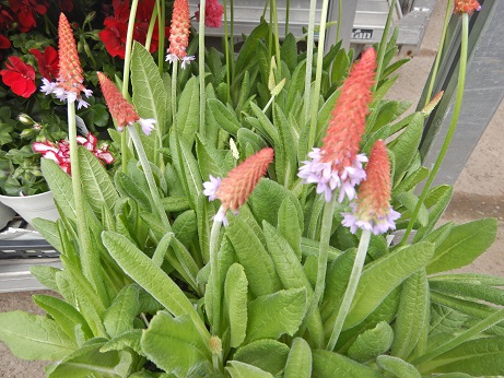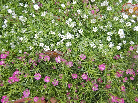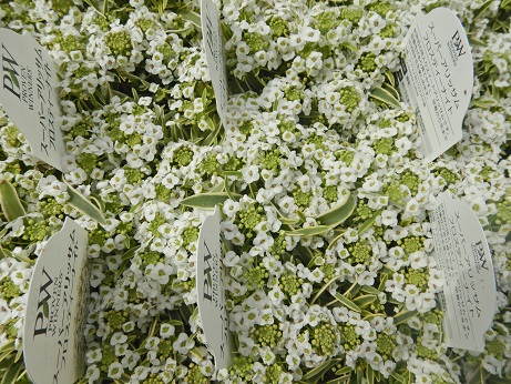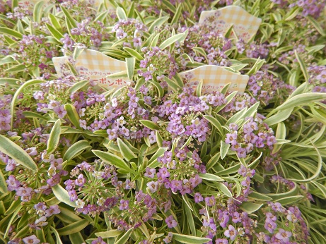 プリムラ『ビアリー』アリッサム『ポンポンブーケ』、斑入りの宿根ワスレナグサも暑いのは苦手なんだけど、今しか入荷しないから入れてみました。斑入りのワスレナグサ、コバ、去年育ててみたけど、なかなかかわいいですよ(*'ω'*)