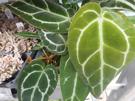 ちょっと珍しい、アンスリウム『クリスタリナム』葉脈がちょっとキラキラしてて、ジュエルオーキッドみたい( *´艸`)超ちっちゃいポットにちょっこりの株なのに、結構値段がするので、多分高価な子なんだと思う(*‘∀‘)