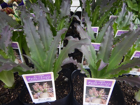 ユーコミス『チョコレートパイン』。一般にパイナップルリリーと呼ばれるお花で、葉の真ん中から花首伸びてきて、パイナップルみたいなお花が咲きます(*'ω'*)花がないときのリーフがブラックできれいなチョコパイン(*'▽')球根植物なんで、育てるのもけっこう簡単(*'ω'*)