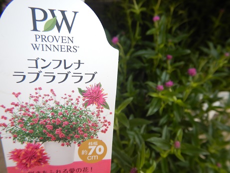 ゴンフレナ『ラブラブラブ』千日紅の仲間で、お花としては『ファイヤーワークス』って品種のコンパクトタイプなのかな?長すぎて困ってたファイヤーワークスのお花とそっくりでコンパクトにまとまる品種なので、すごいカワイイの(*'▽')夏い強いよ~♪♪