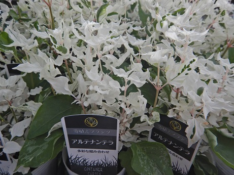 紅白がハッキリしてる『ゲンペイカズラ』赤いのがお花、白いのがガクで、お花が終わっても白いガクが長持ちするので、長く楽しめます(*'ω'*)。クランベリーは今から実が赤くなるのが楽しみ(≧▽≦)