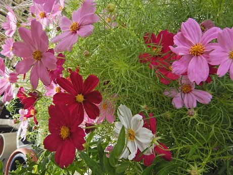 お花が丸くなってきてカワイイポンポン菊に猫のしっぽが短めのキャットテール『メメ』。コスモスのミックス植え(*'▽')