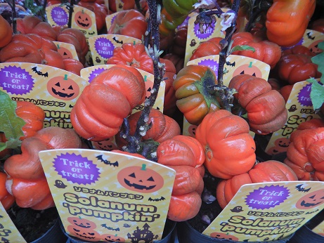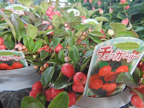 カボチャの形がカワイイ『パンプキンソラナム』ハロウィンにもかわいいから、寄せ植えに人気♪♪ゴテリアとチェッカーベリーは同じもの。今回は実の大きいビックベリーが苗で、チェッカーベリーが鉢植えで少し大株で入ってます。半日陰くらいで匍匐する子で、日陰のグランドカバーにも使えるとか!?ちょっと試してみたいですね(*^-^*)