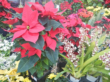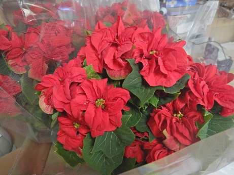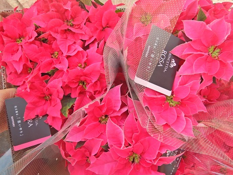 ポインセチアが楽しい時期(≧▽≦)お部屋にあるだけでクリスマス気分♪プリンセチアはピンクの品種なんですけど、八重咲『ローザ』なんか、もうまぶしいくらい明るいピンク(*^-^*)
