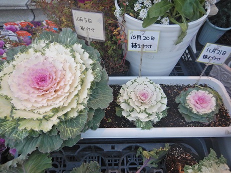 この時期、ちっちゃいハボタンとおっきいハボタン、両方お店に出回ってますよね(*^-^*)実はハボタン、同じ品種でも、植え付け時期によって大きさが随分変わります(*'ω'*)